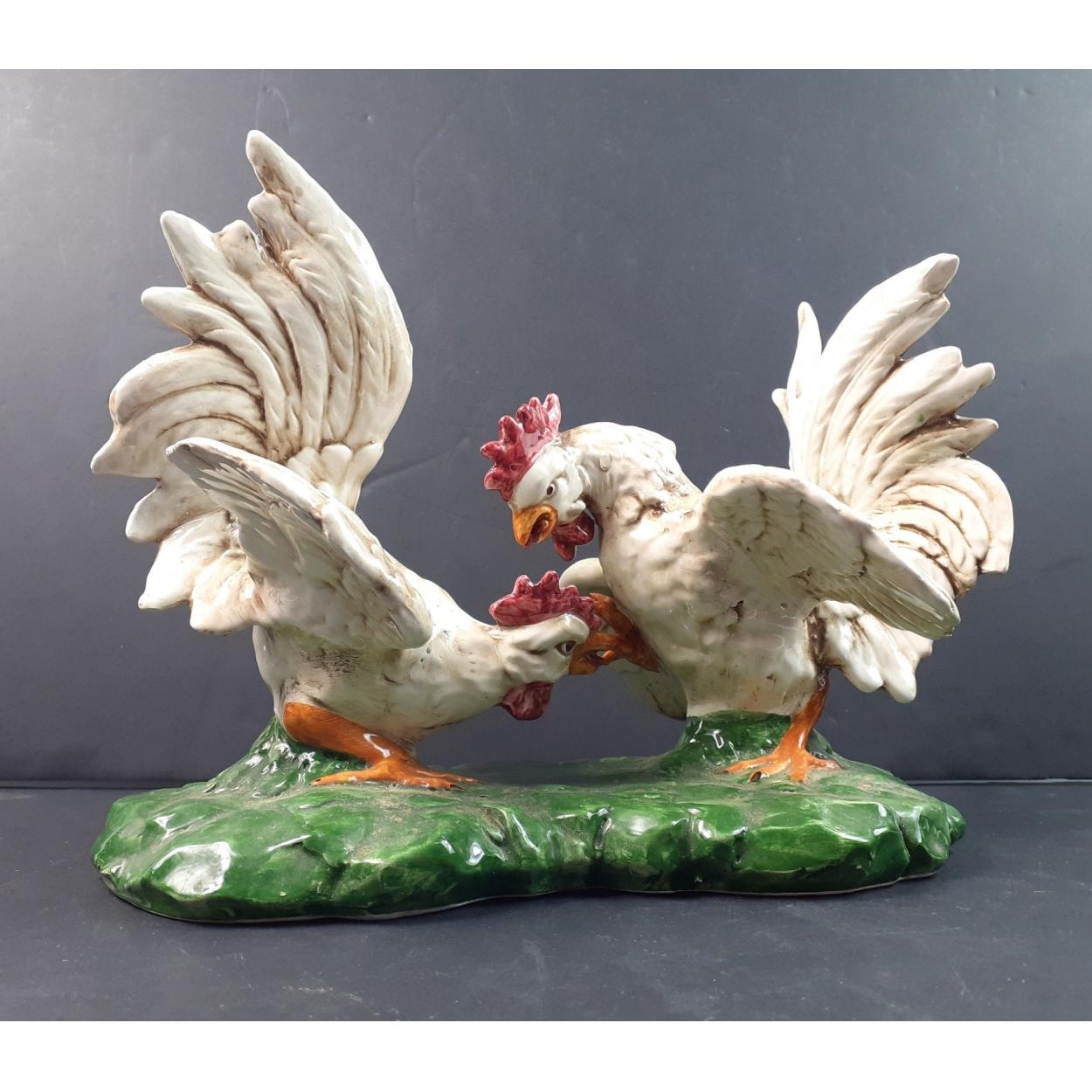 A RARE! BASSONA group of 2 fighting cockerels standing 22cm tall and 30cm across at base approx. No visible damage