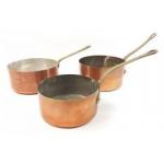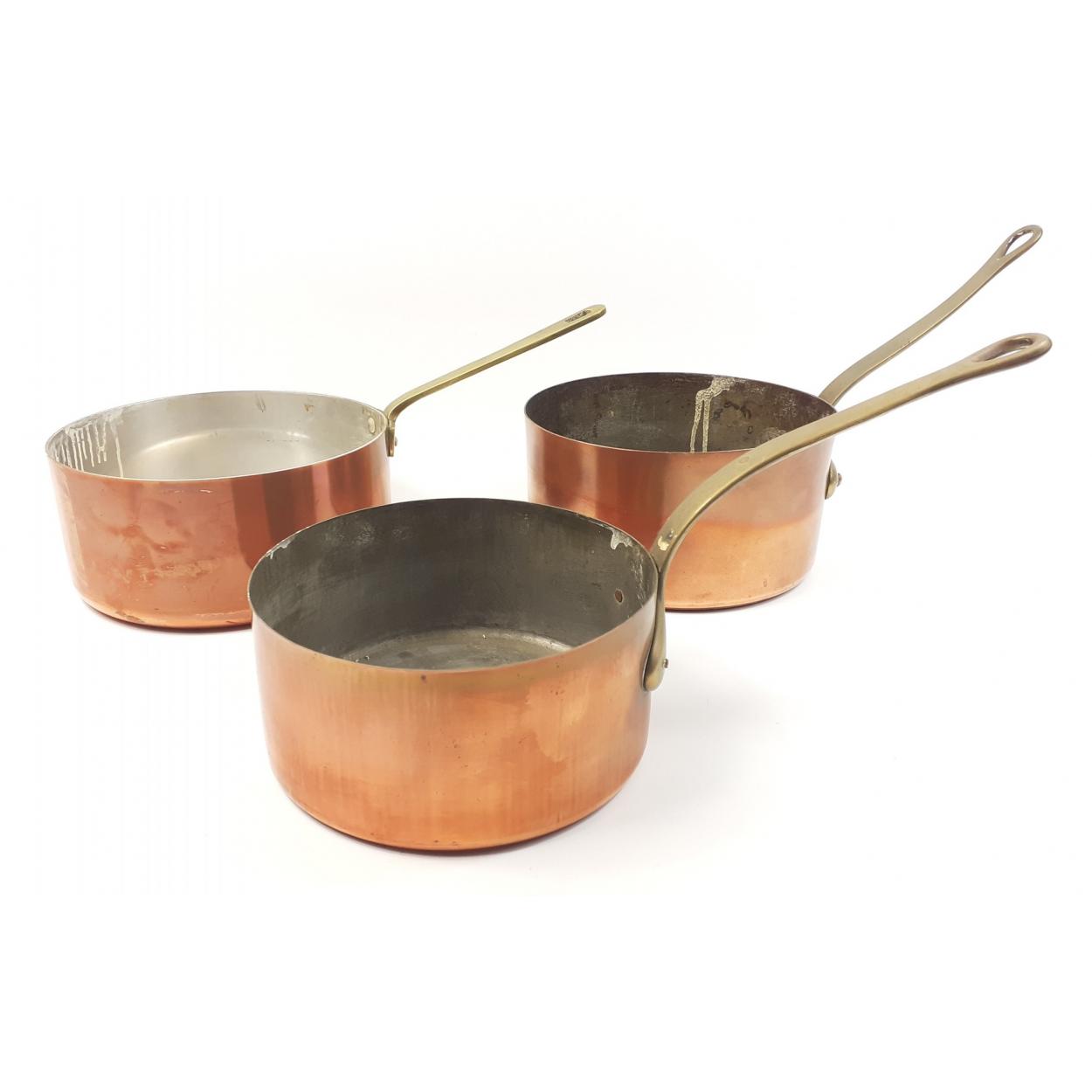 A trio of ANTIQUE brass handled and copper saucepans - largest 21cm diameter approx