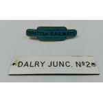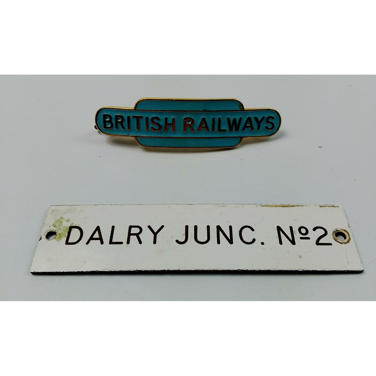 RAILWAY INTEREST. A small plaque DALRY JUNC. No. 2. Believed from Dalry Signal Box in Ayrshire. Measures 10cm approx. Also includes a modern light blue and gilt BRITISH RAILWAYS totem badge.