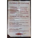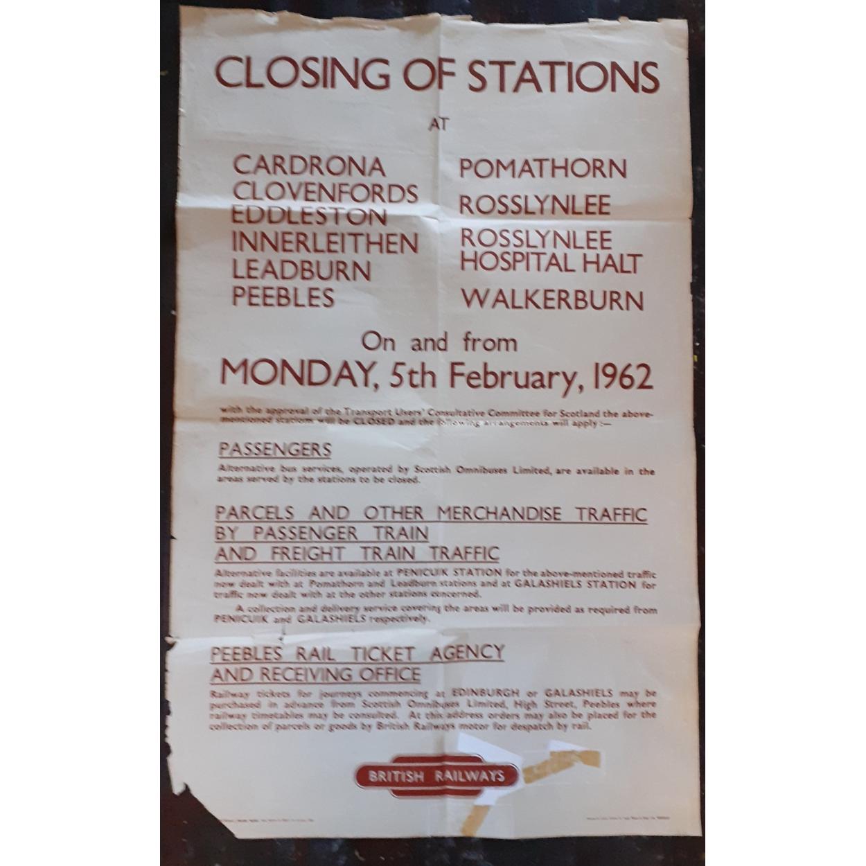 A RARE RARE SURVIVOR. An original 1962 Scottish Region / British Railways station poster announcing the closure of stations at Cardrona, Clovenfords, Eddleston, Innerleithen, Leadburn, Peebles, Pomathorn, Rosslynlee, Rosslynlee Hospital, Walkerburn. 100 x 64cm approx and condition is certainly not perfect. There are edge nibbles and damage/repair marks at the bottom but the fact it exists is incredible.