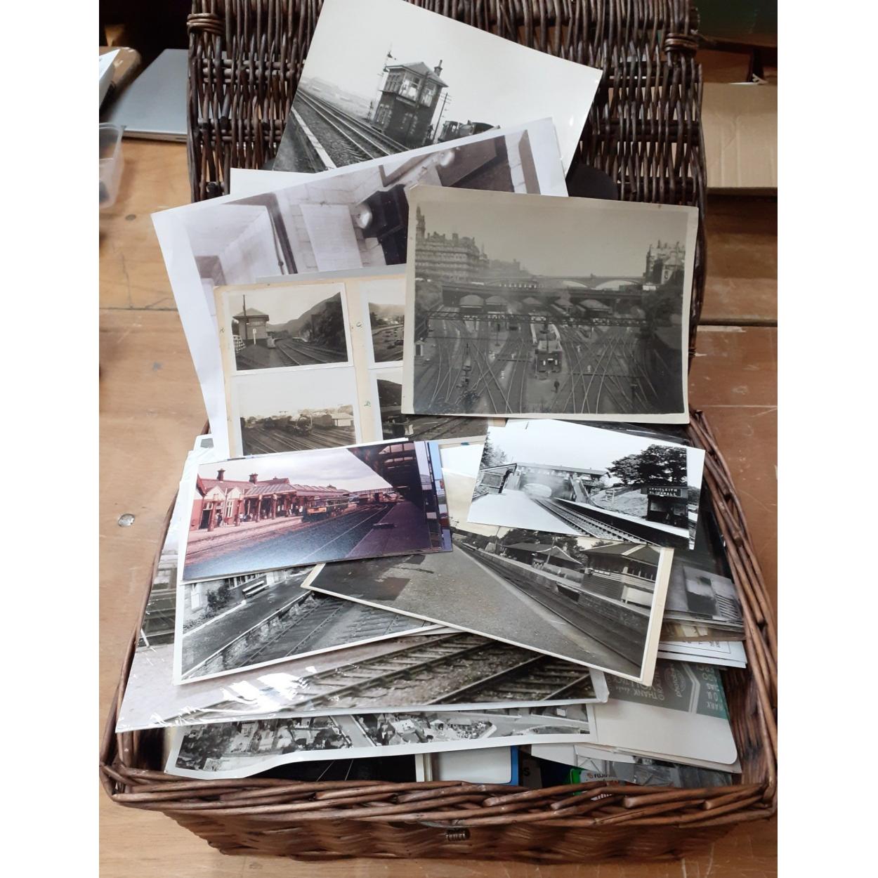 A modern picnic hamper 36 x 27 cm stuffed with modern reprinted photographs all of railway interest. Mostly bought online and mail order by an enthusiast at great expense. Lots and lots of good quality reproductions, a great lot that will take hours to go through.