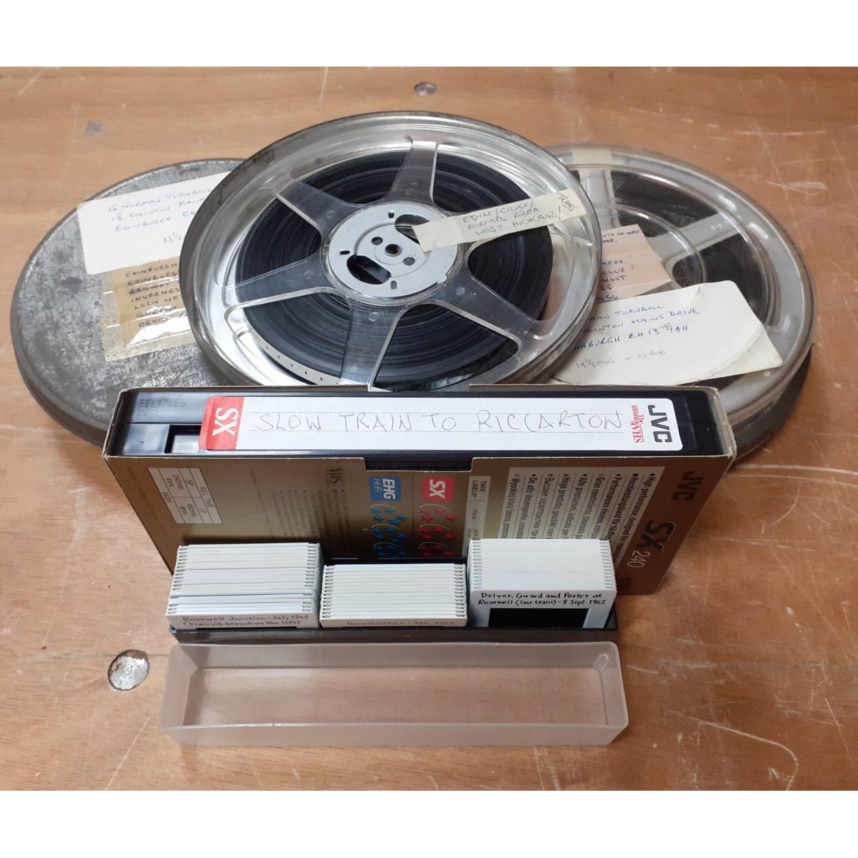 One for the Railway archivists ! A lot of five tinned movie reels of RAILWAY interest as well as some slides and a VHS video. Includes a movie titled 'Peebles Line'