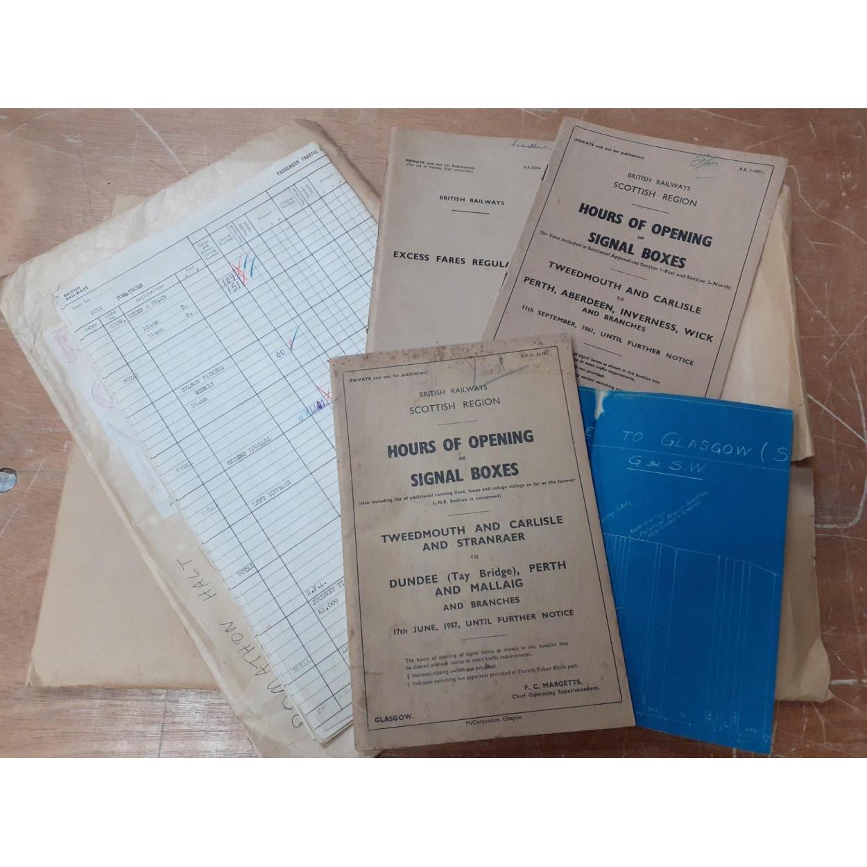 RAILWAY ephemera to include British Rail Scottish Region publications x3. Pomathorn Halt passenger book pages from 1961 and reprinted tokenless block signalling diagrams.