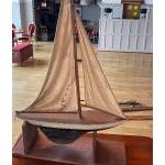 SAIL AWAY! A large antique model pond yacht in full sale on its stand - of wooden construction with cotton canvas sails - dimensions length 75cm x height 120cm approx
