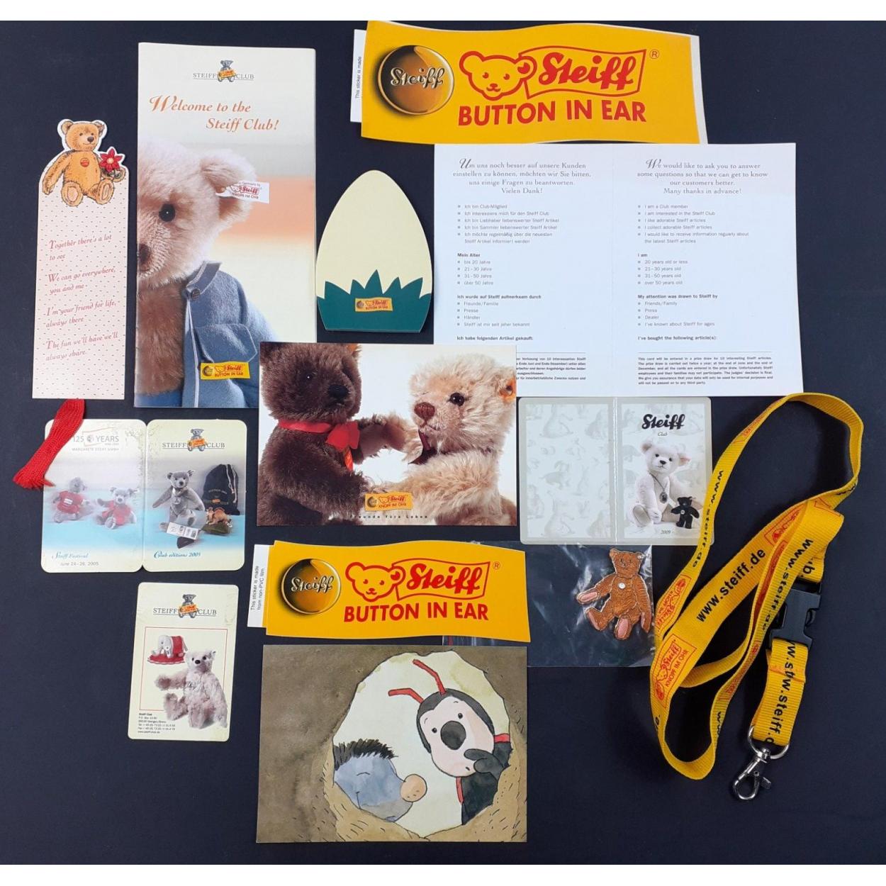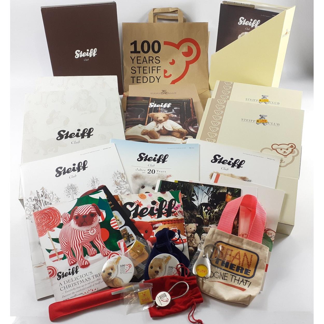 LARGE BOX OF STEIFF ACESSORIES - For the true fan of STEIFF teddies, a gilt Steiff brooch (5cm long), plus a collection of ephemera to include a Steiff Club Germany lanyard, a post-it pad and various stickers, postcards etc