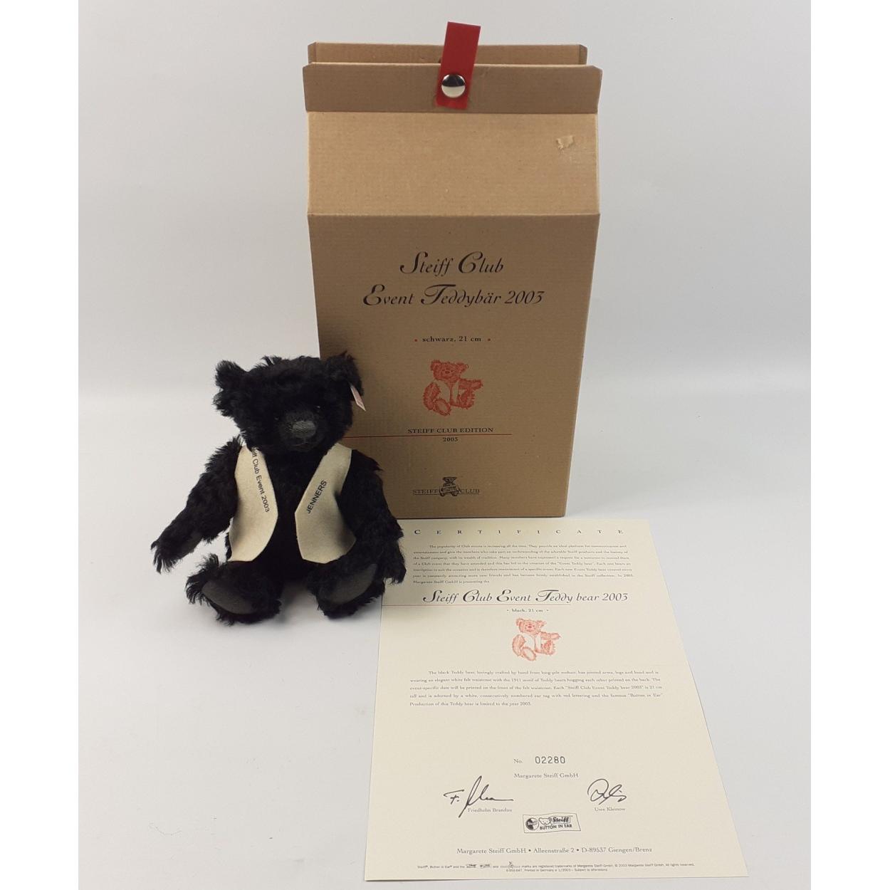 A STEIFF black event bear 2003, with JENNERS waistcoat, reference 420382, stands 21cm high, mohair fur, comes with certificate number 02280 in original box