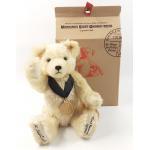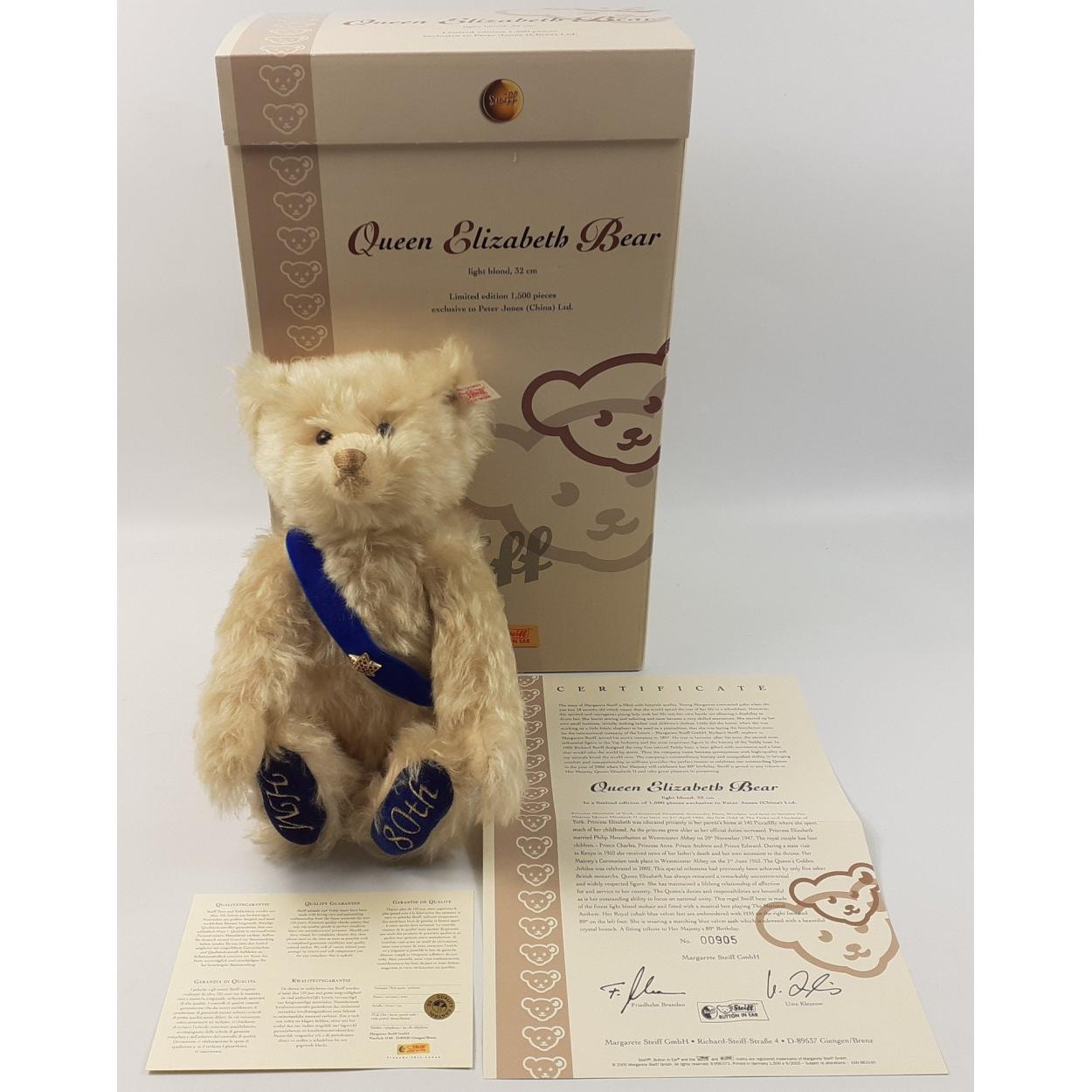 A light blond STEIFF Queen Elizabeth 80th birthday bear, reference 662140, standing 32cm high in its original unopened box, limited edition exclusive to Peter Jones, certificate 00905 of 1500. The bear is musical and plays "God save the Queen".