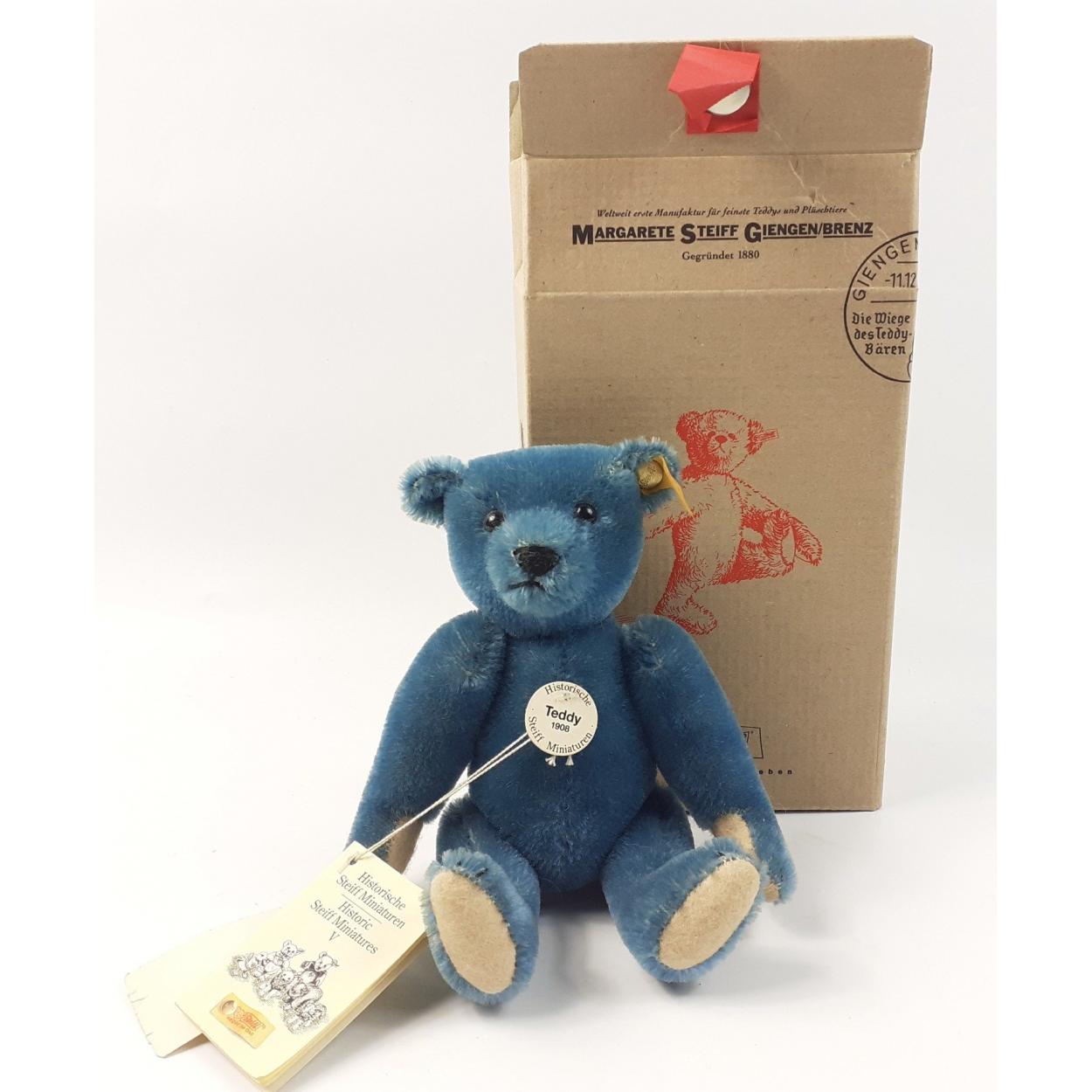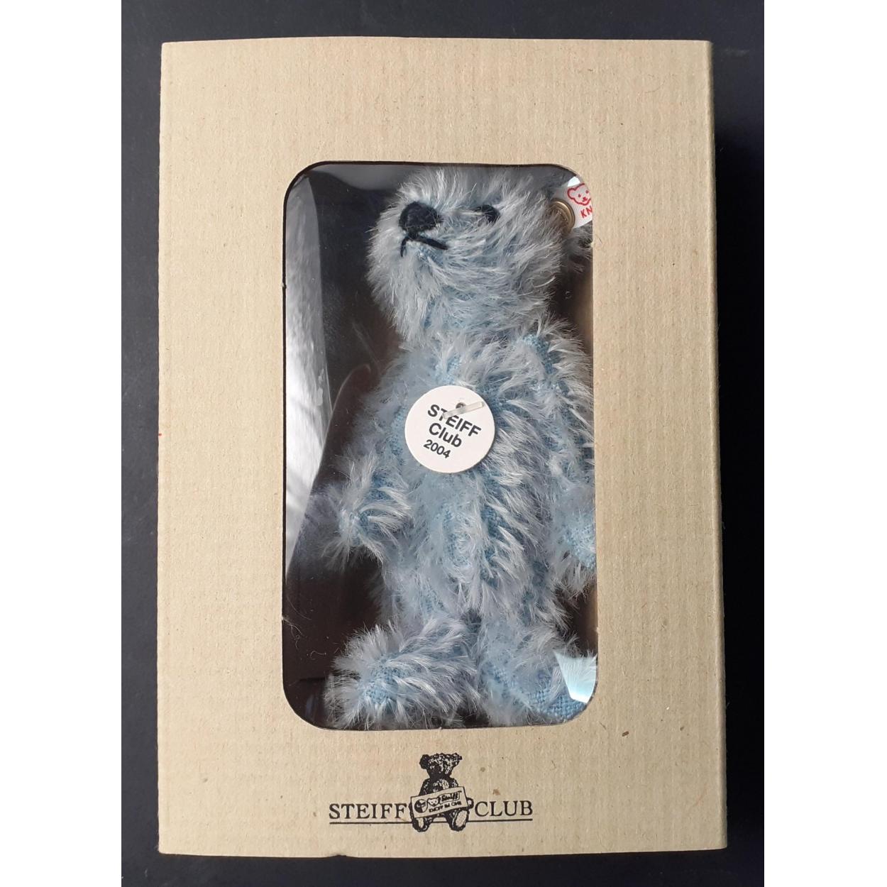 A STEIFF CLUB 2004 blue teddy bear in its box, stands 7cm high with certificate
