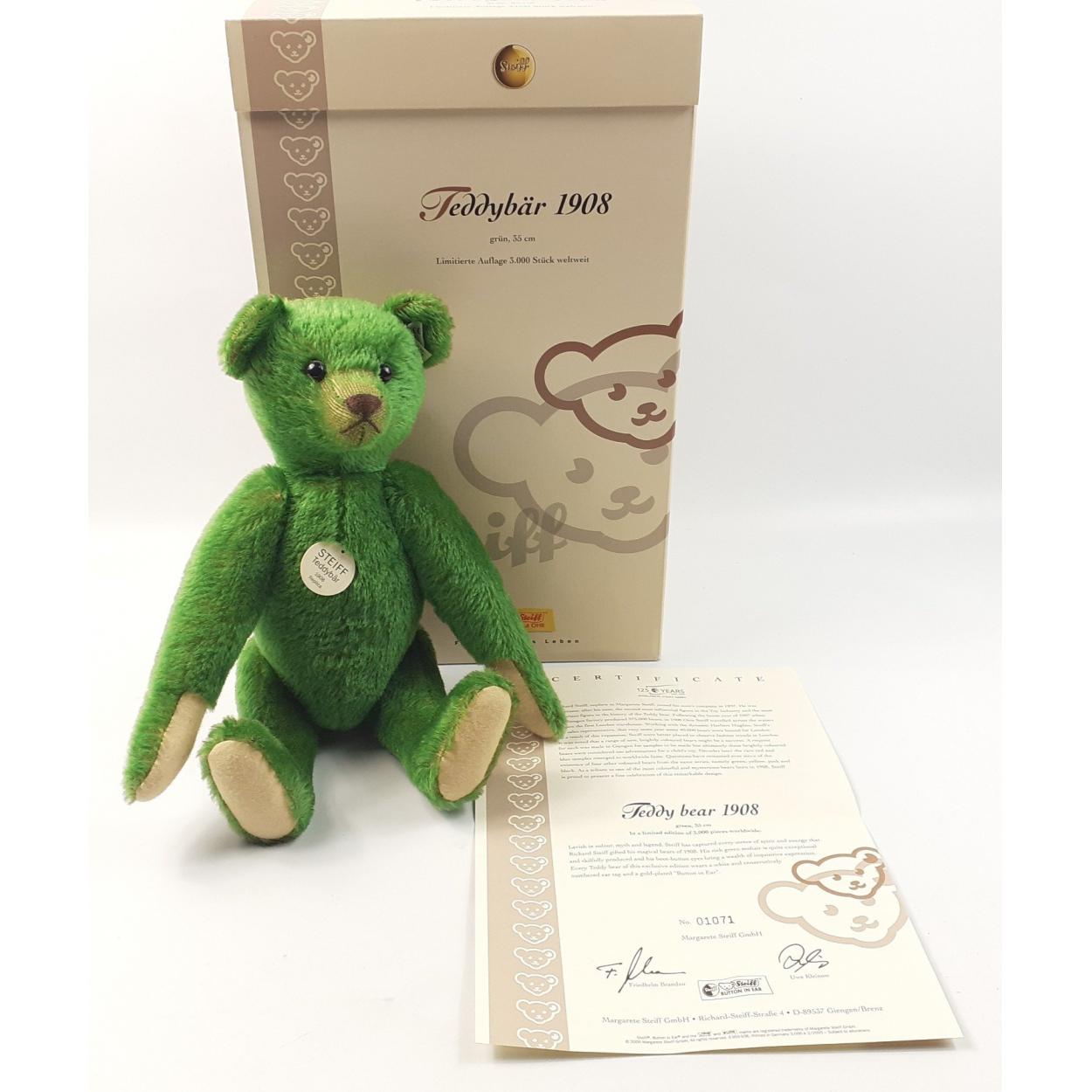 A STEIFF green 1908 Ours Teddy, reference 408540, stands 35cm tall, with certificate number 01071 of a limited edition of 3000 in original box