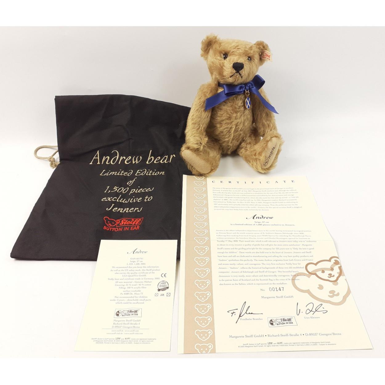 A STEIFF Andrew bear, reference 661761, exclusive to JENNERS, signed SIMON, standing 27cm high, with Saltire medallion on a blue ribbon, from a limited edition of 1500 certificate number 00147, in a black embroidered drawstring bag,