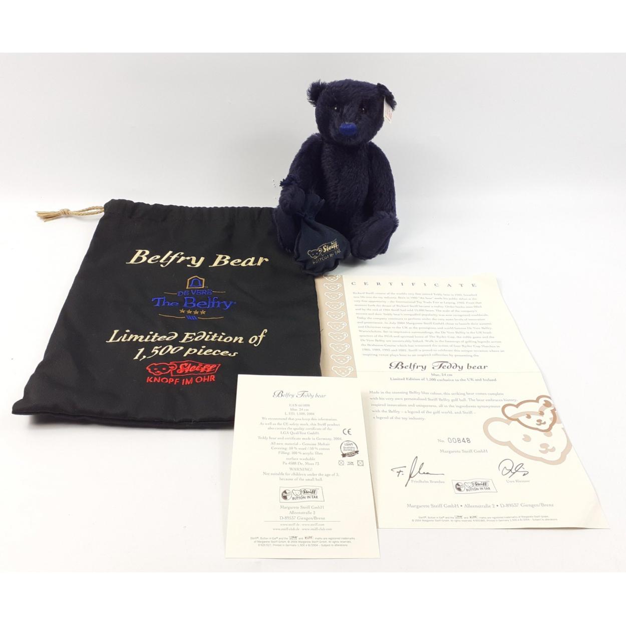 A STEIFF blue belfry bear, reference 661808, standing 24cm tall, with his very own golf ball in a drawstring bag, certificate number 00848 of a limited edition of 1500. Teddy comes in an embroidered black drawstring bag