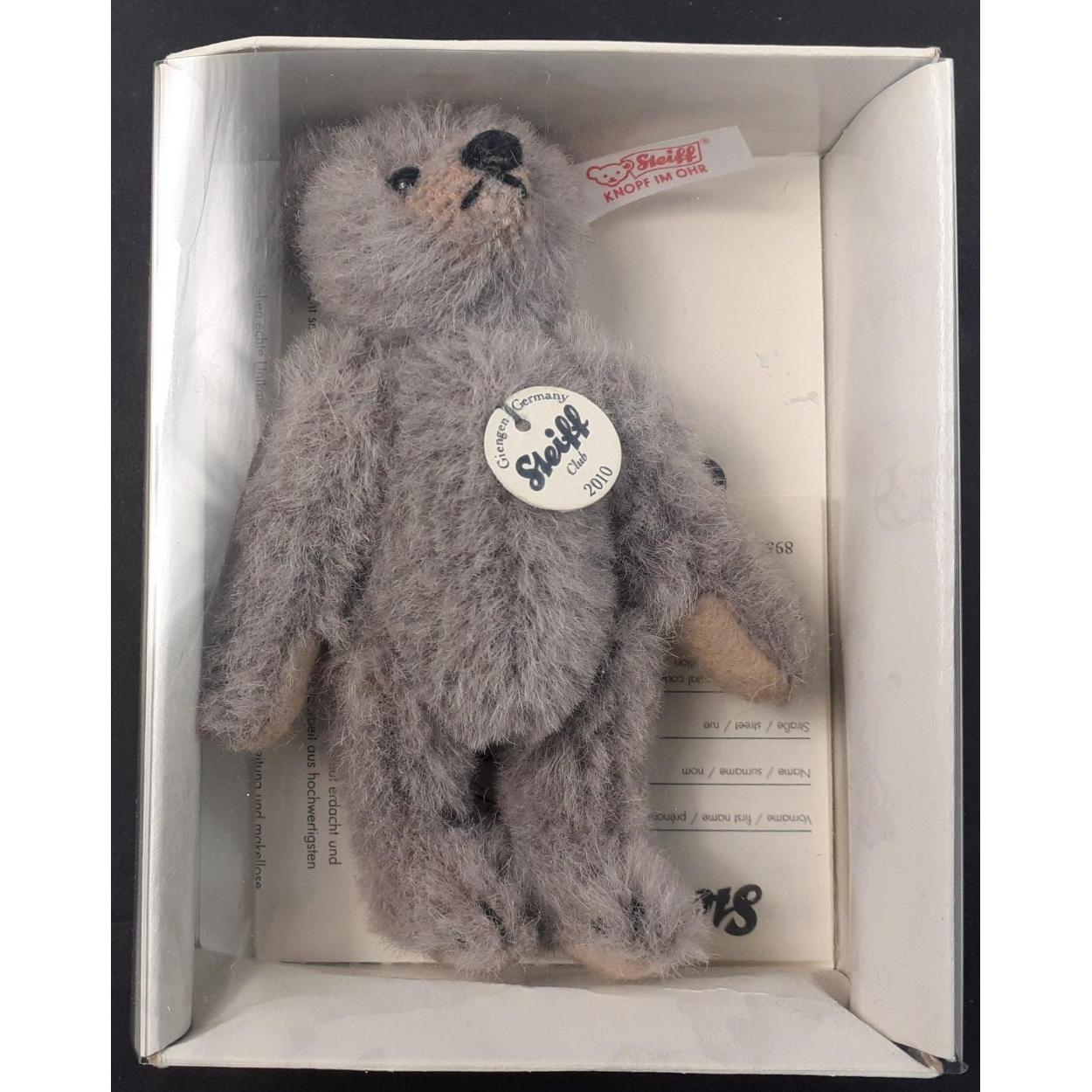 A STEIFF CLUB 2010 silver teddy bear in its box, stands 10cm high with certificate