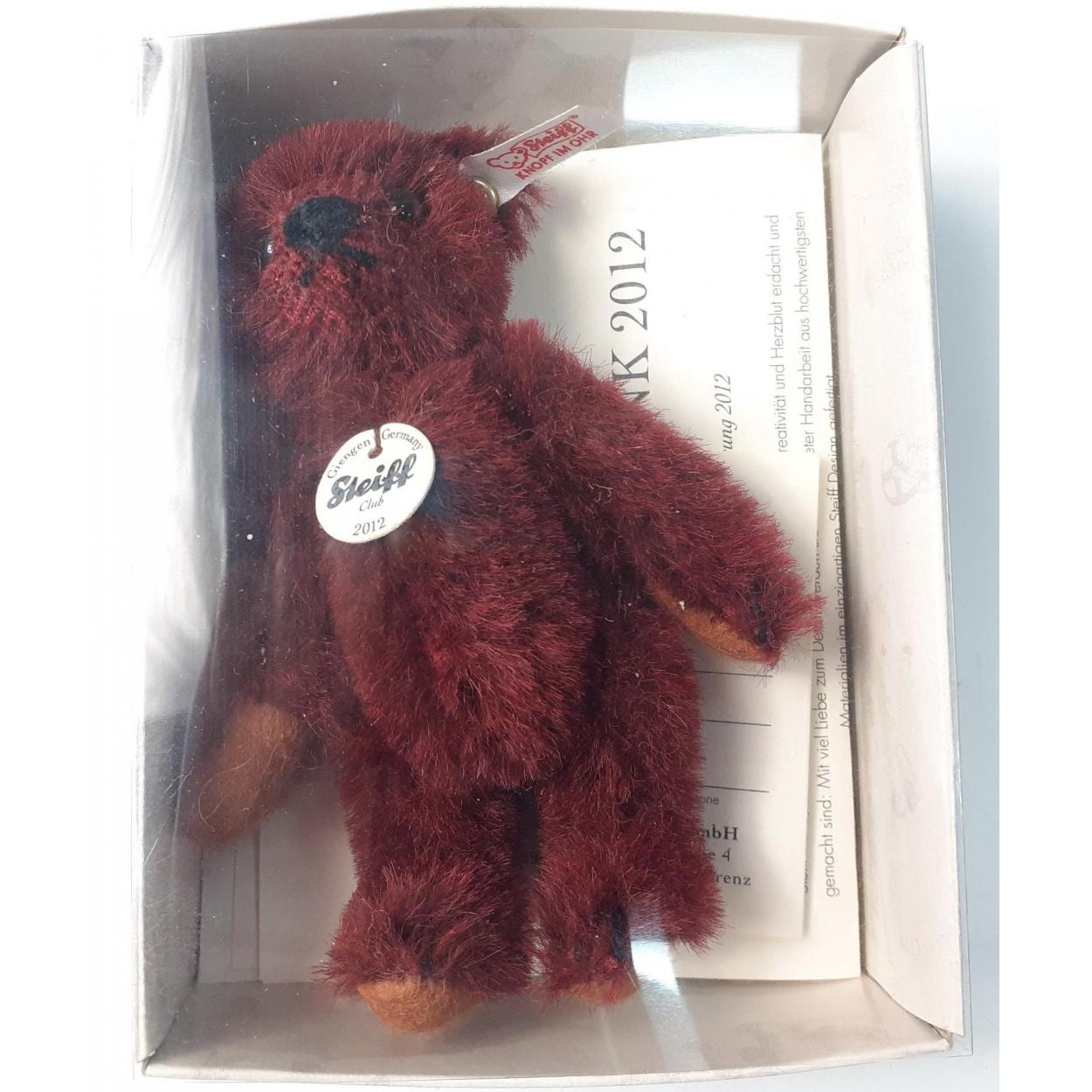 A STEIFF CLUB 2012 burgundy teddy bear in its box, stands 10cm high with certificate