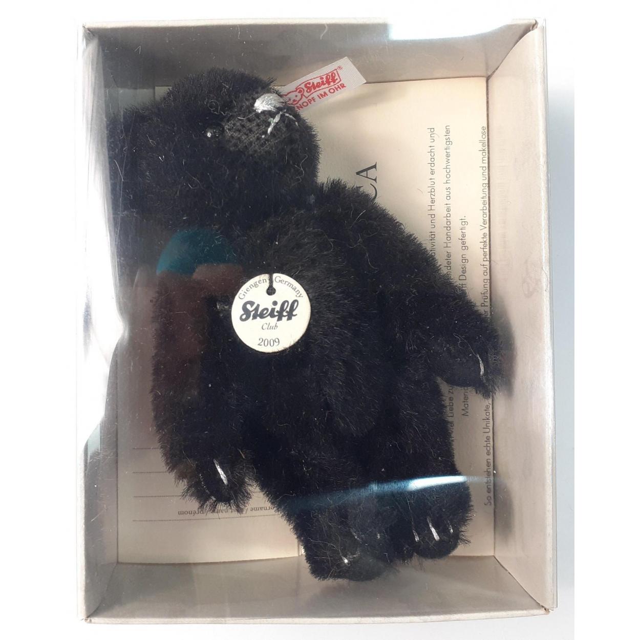 A STEIFF CLUB 2009 black teddy bear in its box, stands 10cm high with certificate