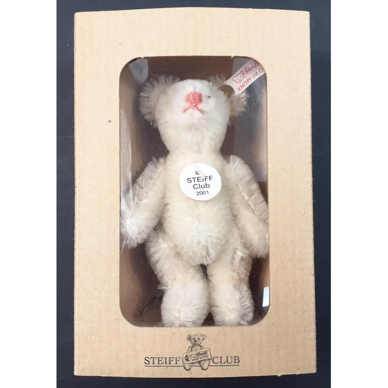A STEIFF CLUB 2001 white teddy bear in its box, stands 7cm high with certificate