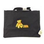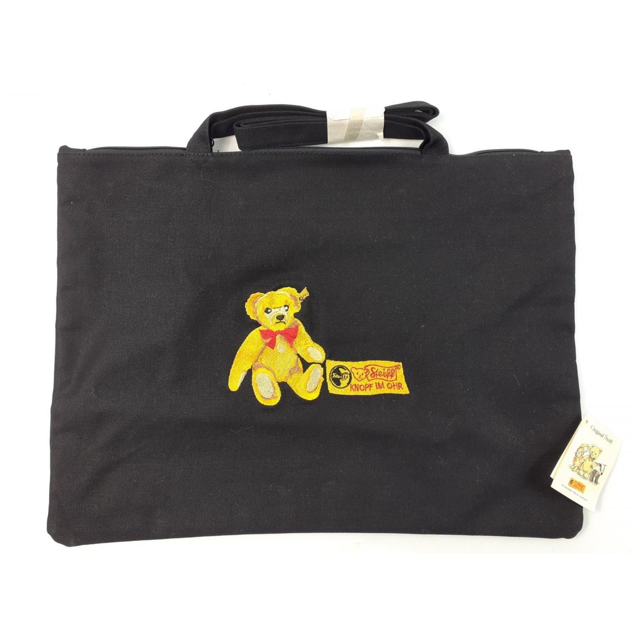An unused black fabric briefcase style STEIFF bag reference number 601286, with embroidered teddy and logo on the front 47x35cm approx. With labels