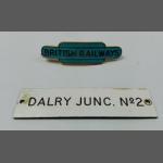 RAILWAY INTEREST. A small plaque DALRY JUNC. No. 2. Believed from Dalry Signal Box in Ayrshire. Measures 10cm approx. Also includes a modern light blue and gilt BRITISH RAILWAYS totem badge.
