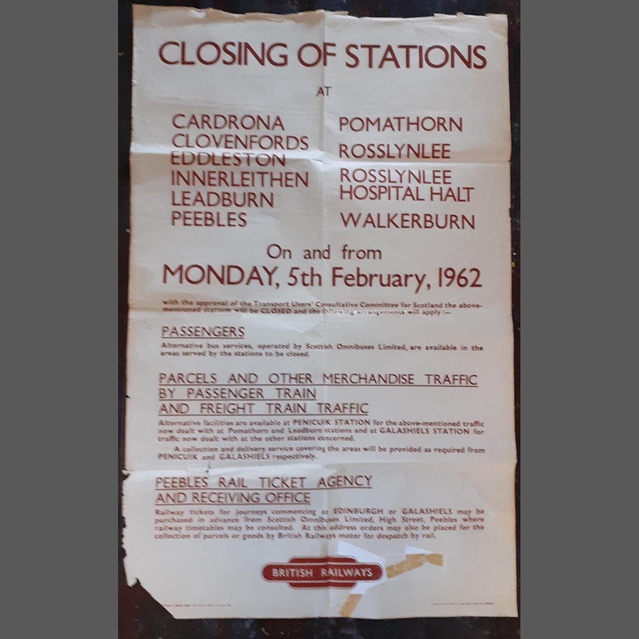 A RARE RARE SURVIVOR. An original 1962 Scottish Region / British Railways station poster announcing the closure of stations at Cardrona, Clovenfords, Eddleston, Innerleithen, Leadburn, Peebles, Pomathorn, Rosslynlee, Rosslynlee Hospital, Walkerburn. 100 x 64cm approx and condition is certainly not perfect. There are edge nibbles and damage/repair marks at the bottom but the fact it exists is incredible.