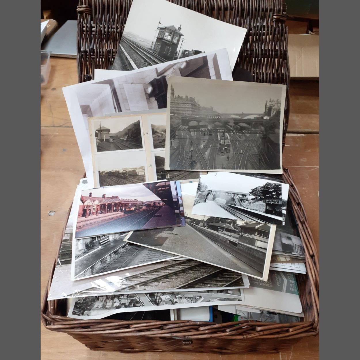 A modern picnic hamper 36 x 27 cm stuffed with modern reprinted photographs all of railway interest. Mostly bought online and mail order by an enthusiast at great expense. Lots and lots of good quality reproductions, a great lot that will take hours to go through.