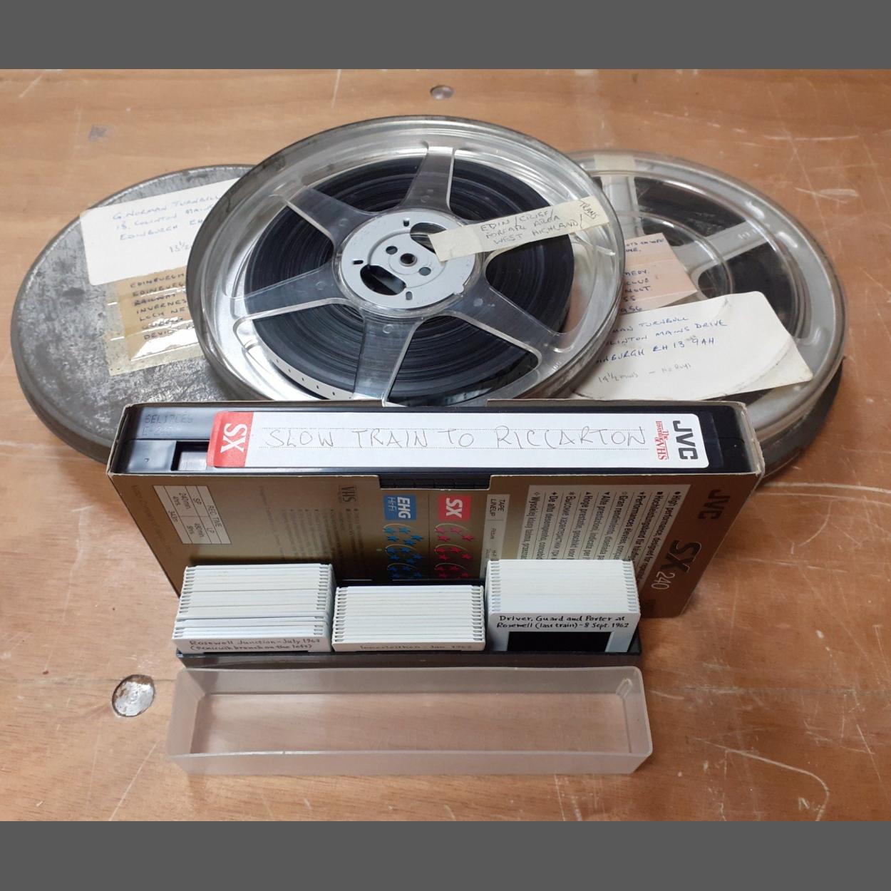 One for the Railway archivists ! A lot of five tinned movie reels of RAILWAY interest as well as some slides and a VHS video. Includes a movie titled 'Peebles Line'