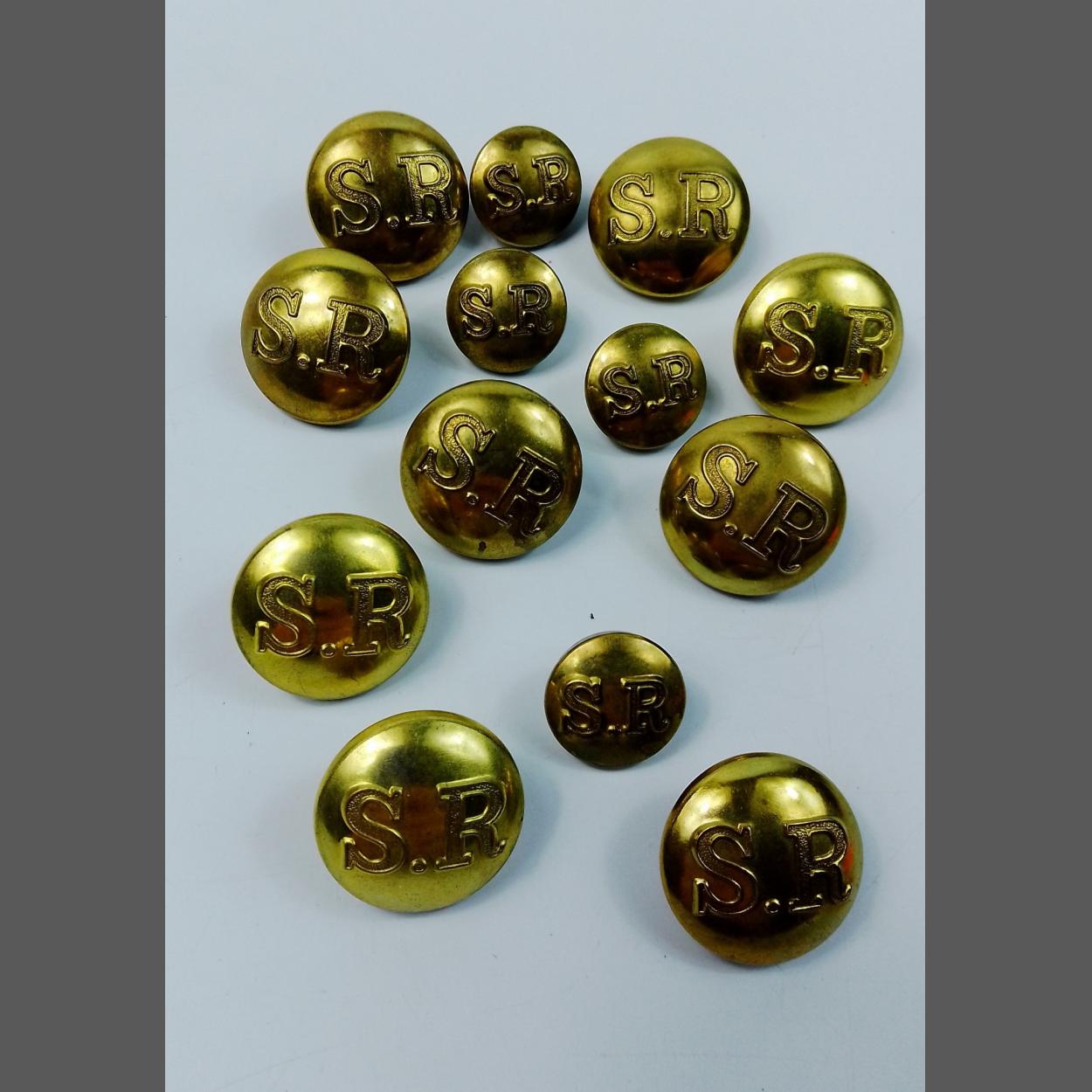 SOUTHERN RAILWAY S.R. stamped brass uniform buttons. Nine large and four small brass buttons by Firmin.