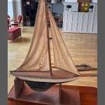 SAIL AWAY! A large antique model pond yacht in full sale on its stand - of wooden construction with cotton canvas sails - dimensions length 75cm x height 120cm approx