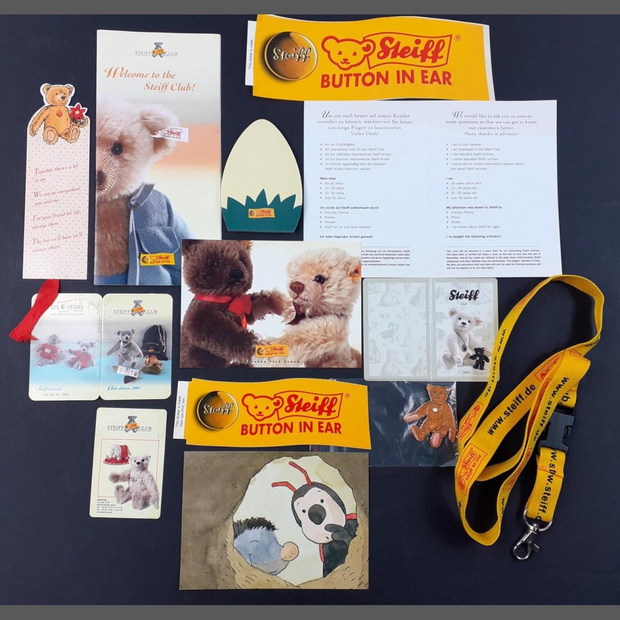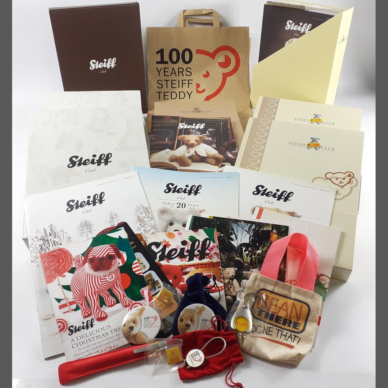 LARGE BOX OF STEIFF ACESSORIES - For the true fan of STEIFF teddies, a gilt Steiff brooch (5cm long), plus a collection of ephemera to include a Steiff Club Germany lanyard, a post-it pad and various stickers, postcards etc