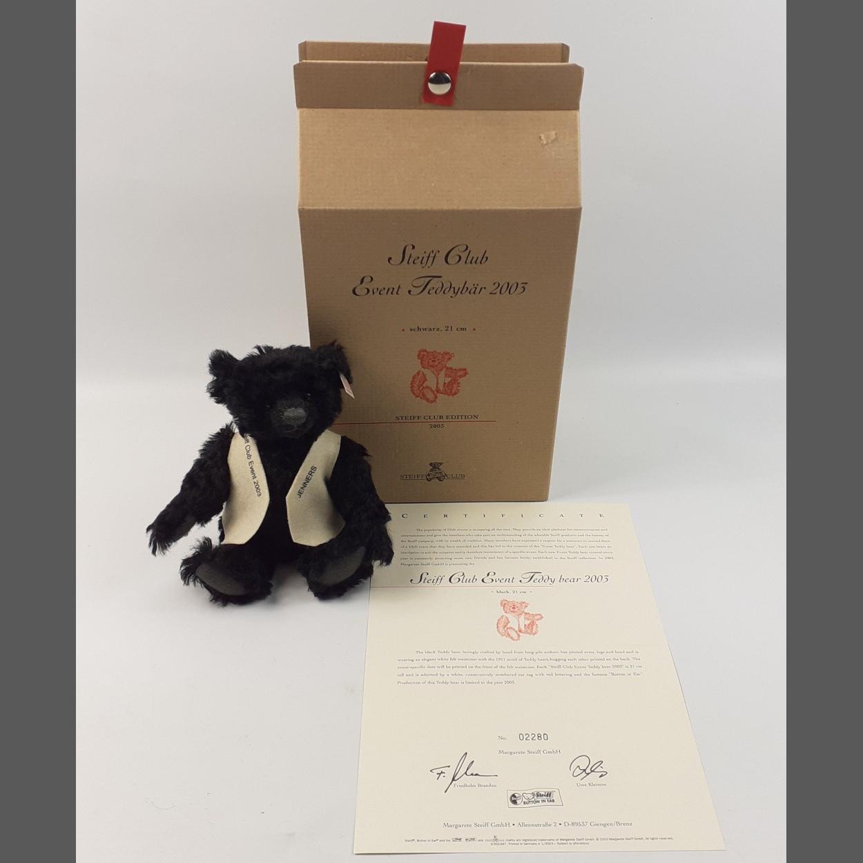 A STEIFF black event bear 2003, with JENNERS waistcoat, reference 420382, stands 21cm high, mohair fur, comes with certificate number 02280 in original box