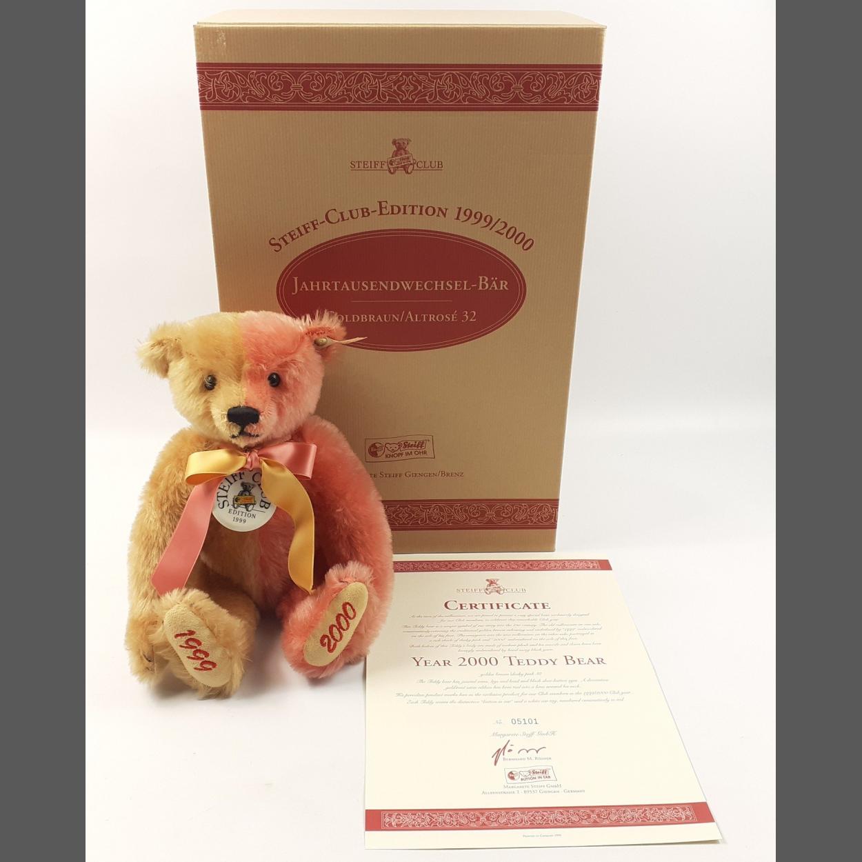 A new STEIFF Year 2000 Brown/Pink bear, reference 420184, mohair fur, with a porcelain pendant on a ribbon, standing 32cm high, Steiff Club Edition 1999/2000, certificate number 0501in original box