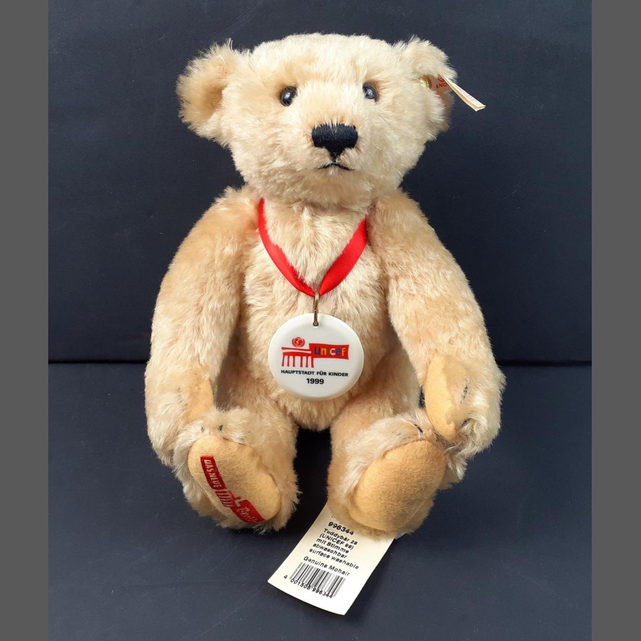 A STEIFF UNICEF 1999 teddy bear standing 28cm high, reference number 996344, with porcelain medallion on red ribbon and labels attached, number 00461 of a limited edition.