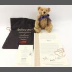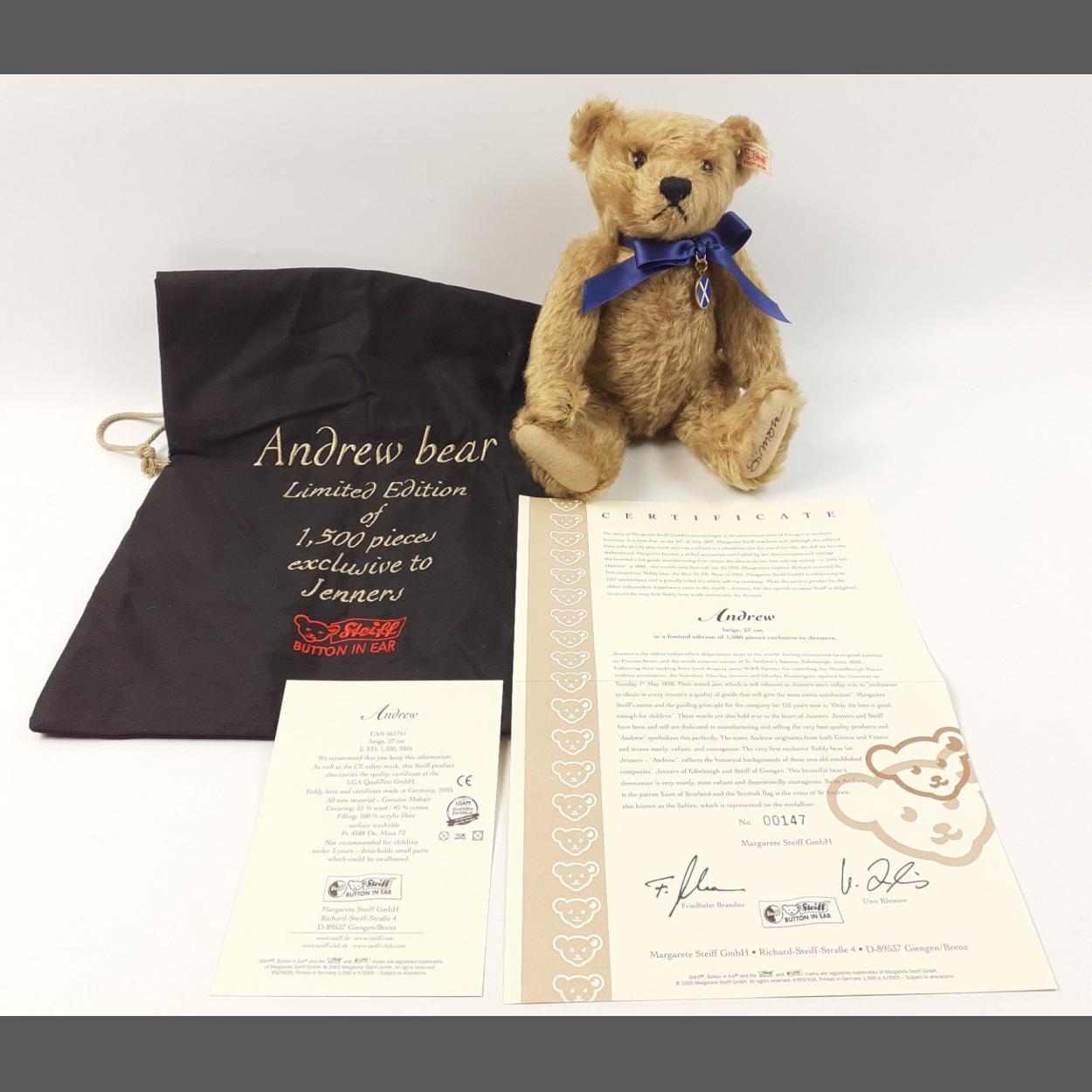 A STEIFF Andrew bear, reference 661761, exclusive to JENNERS, signed SIMON, standing 27cm high, with Saltire medallion on a blue ribbon, from a limited edition of 1500 certificate number 00147, in a black embroidered drawstring bag,