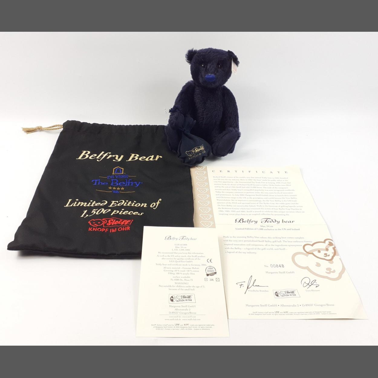 A STEIFF blue belfry bear, reference 661808, standing 24cm tall, with his very own golf ball in a drawstring bag, certificate number 00848 of a limited edition of 1500. Teddy comes in an embroidered black drawstring bag