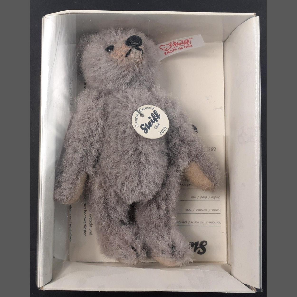 A STEIFF CLUB 2010 silver teddy bear in its box, stands 10cm high with certificate