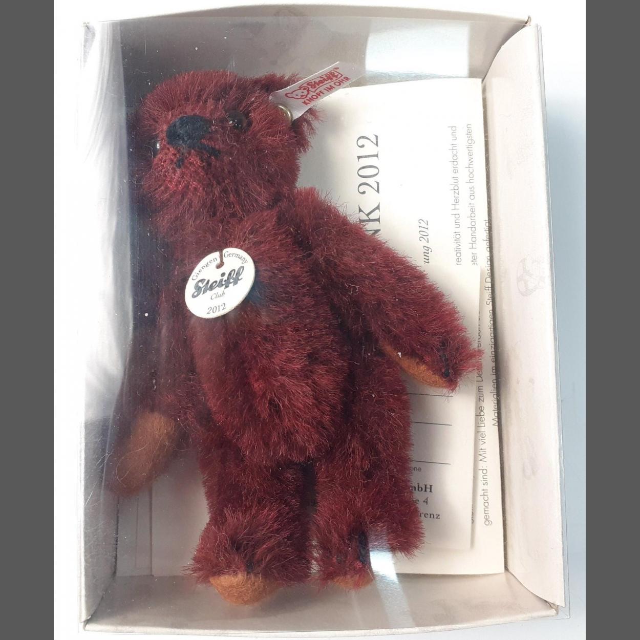 A STEIFF CLUB 2012 burgundy teddy bear in its box, stands 10cm high with certificate