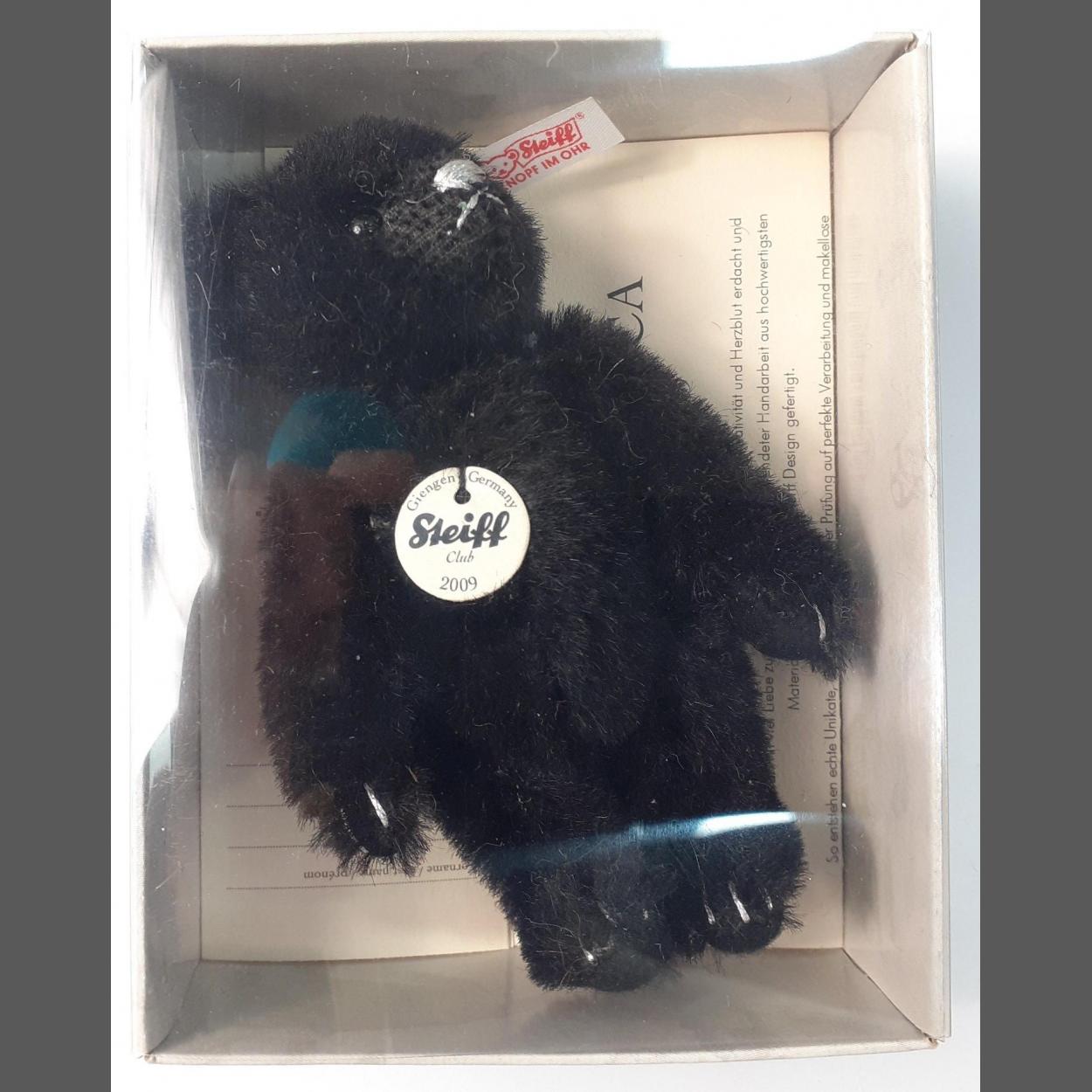 A STEIFF CLUB 2009 black teddy bear in its box, stands 10cm high with certificate