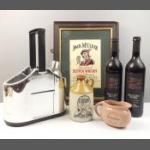 A mixed box to include two bottles of mulled wine, each 75cl, a sealed flagon of FIRKIN Cornish Scrumpy, 568ml, a cocktail shaker, a small CRAWFORD'S water jug and a framed picture of JOCK McCLURE Blended Scotch Whisky, frame size 40x32cm (some water damage to print)