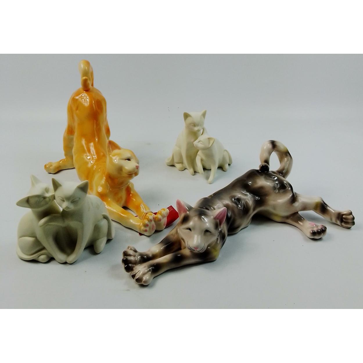 A small collection of decorative cats to include 2 pairs of white cats 10cm high, and 2 luxuriantly stretching cats 29cm and 24cm long,