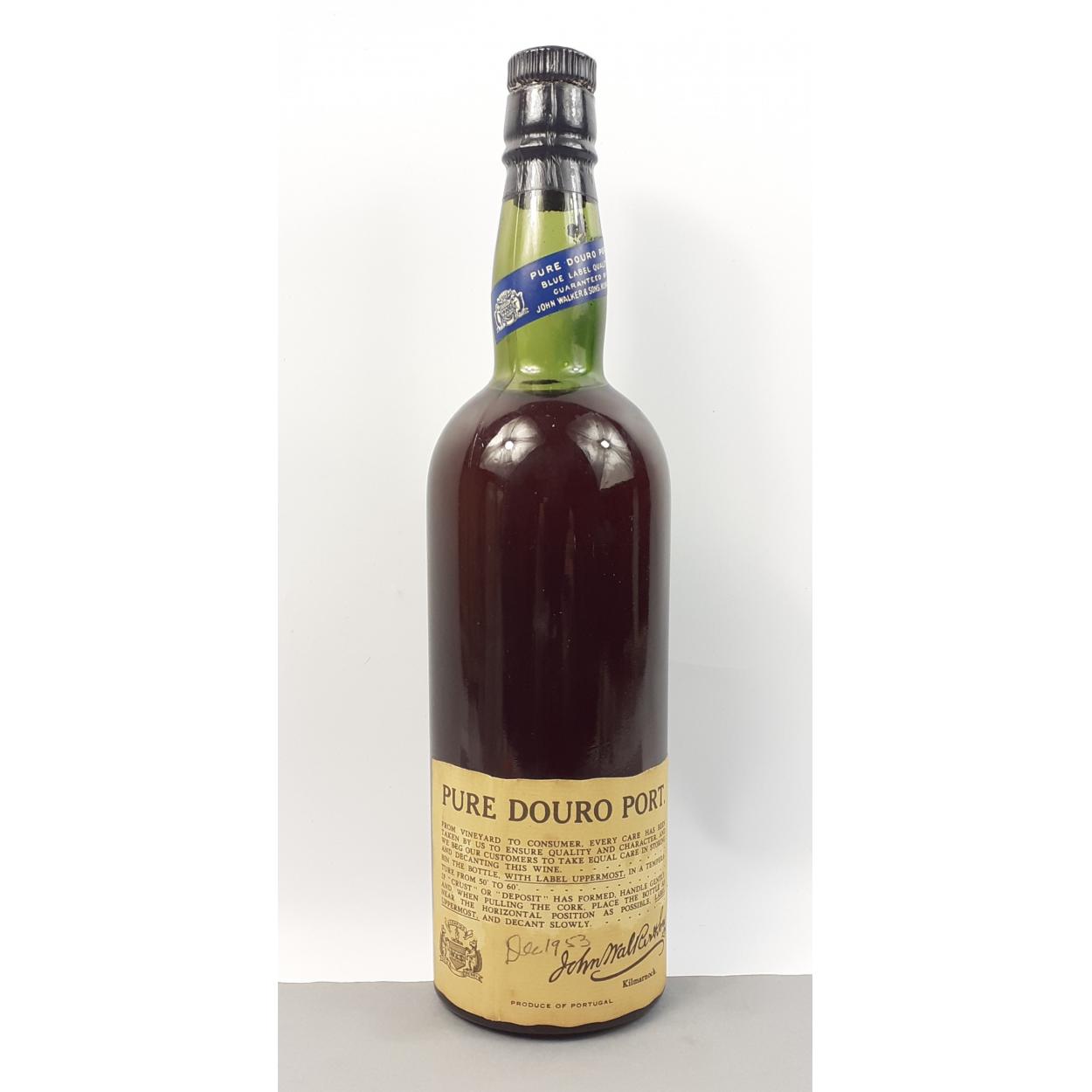 RARE! VINTAGE PURE DOURO PORT (70cl size approx as no size stated) GUARANTEED BY JOHN WALKER & SONS BLUE LABEL QUALITY- Proudly displaying Kilmarnock's Confido Gold Berry coat of arms No stated ABV or bottle size, but approximately 70cl Bottle and label in good condition A miniature black label port sold at auction for £70 March 2022 - current label has a pencil date of Dec 1953