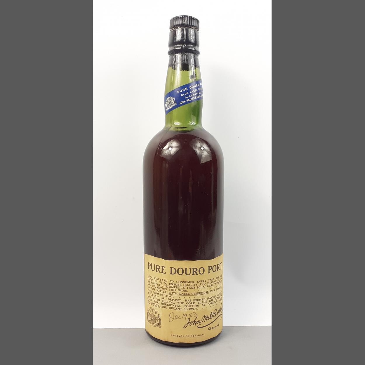 RARE! VINTAGE PURE DOURO PORT (70cl size approx as no size stated) GUARANTEED BY JOHN WALKER & SONS BLUE LABEL QUALITY- Proudly displaying Kilmarnock's Confido Gold Berry coat of arms No stated ABV or bottle size, but approximately 70cl Bottle and label in good condition A miniature black label port sold at auction for £70 March 2022 - current label has a pencil date of Dec 1953
