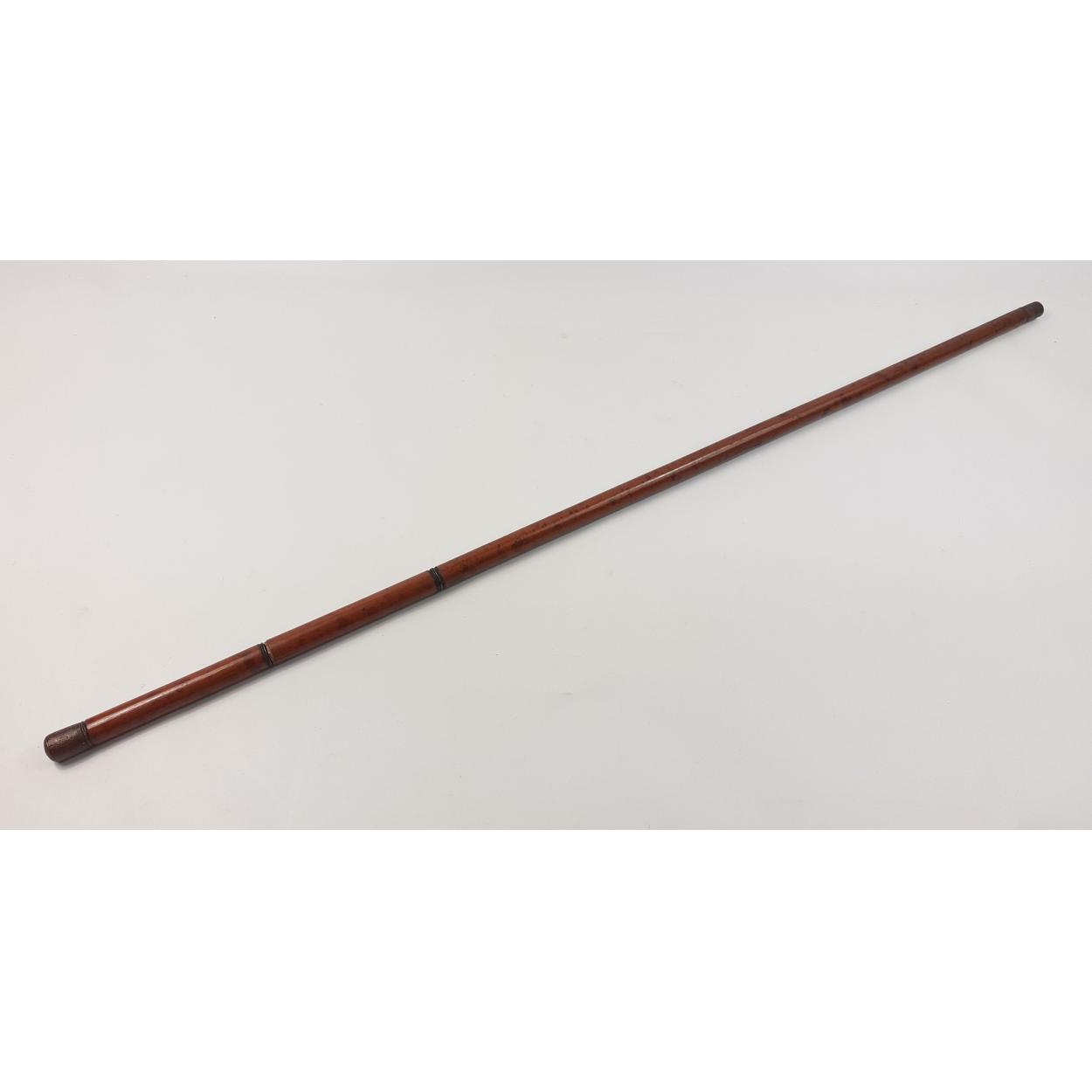 A fine gentleman's three piece walking cane with hidden fountain pen. 90cm approx. Slight damage to the wood and finial at the top screw joint but remains a wonderful old piece.