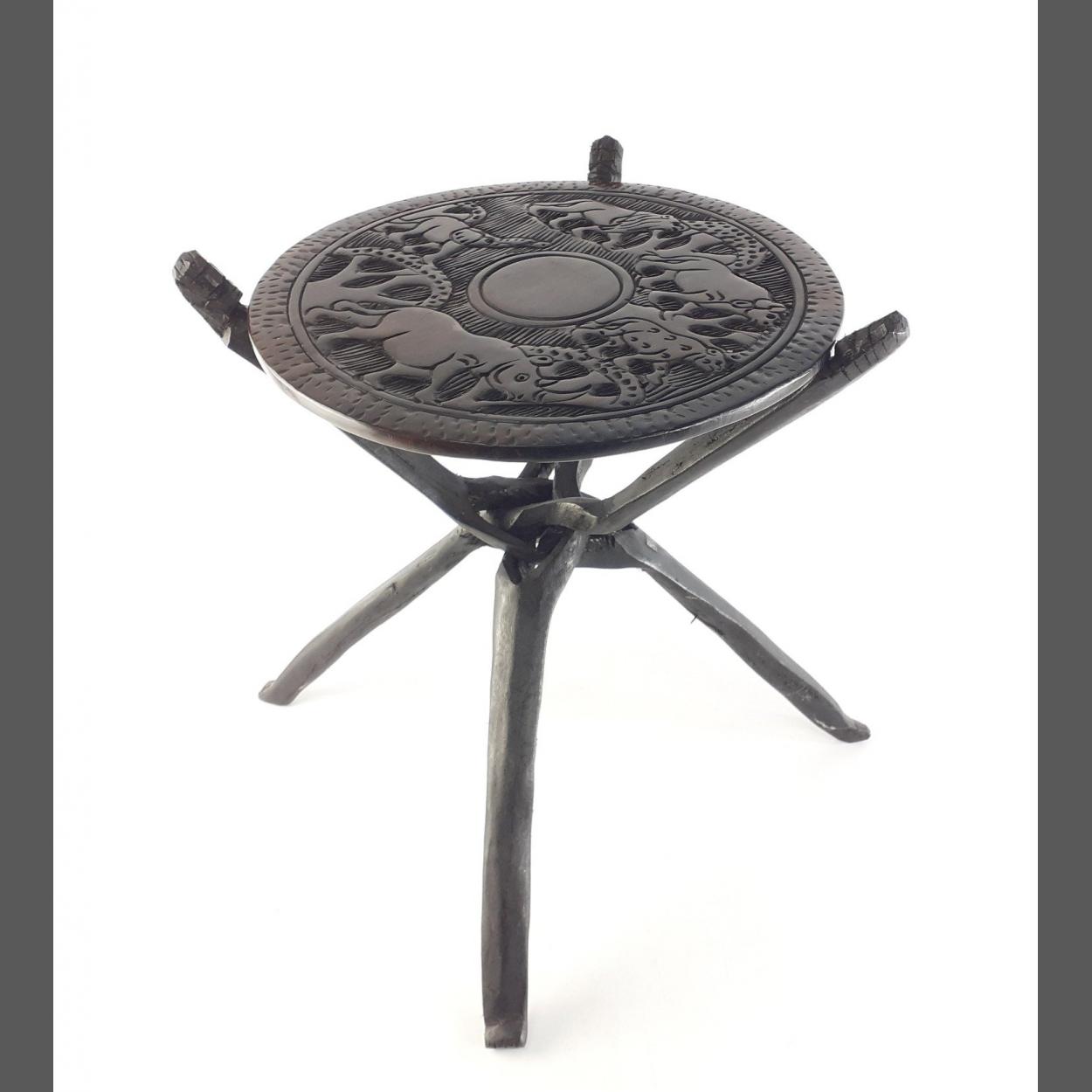 An African HAND CARVED carved wooden folding table with African animal's carved to top stands 40cm tall and 35cm diameter approx