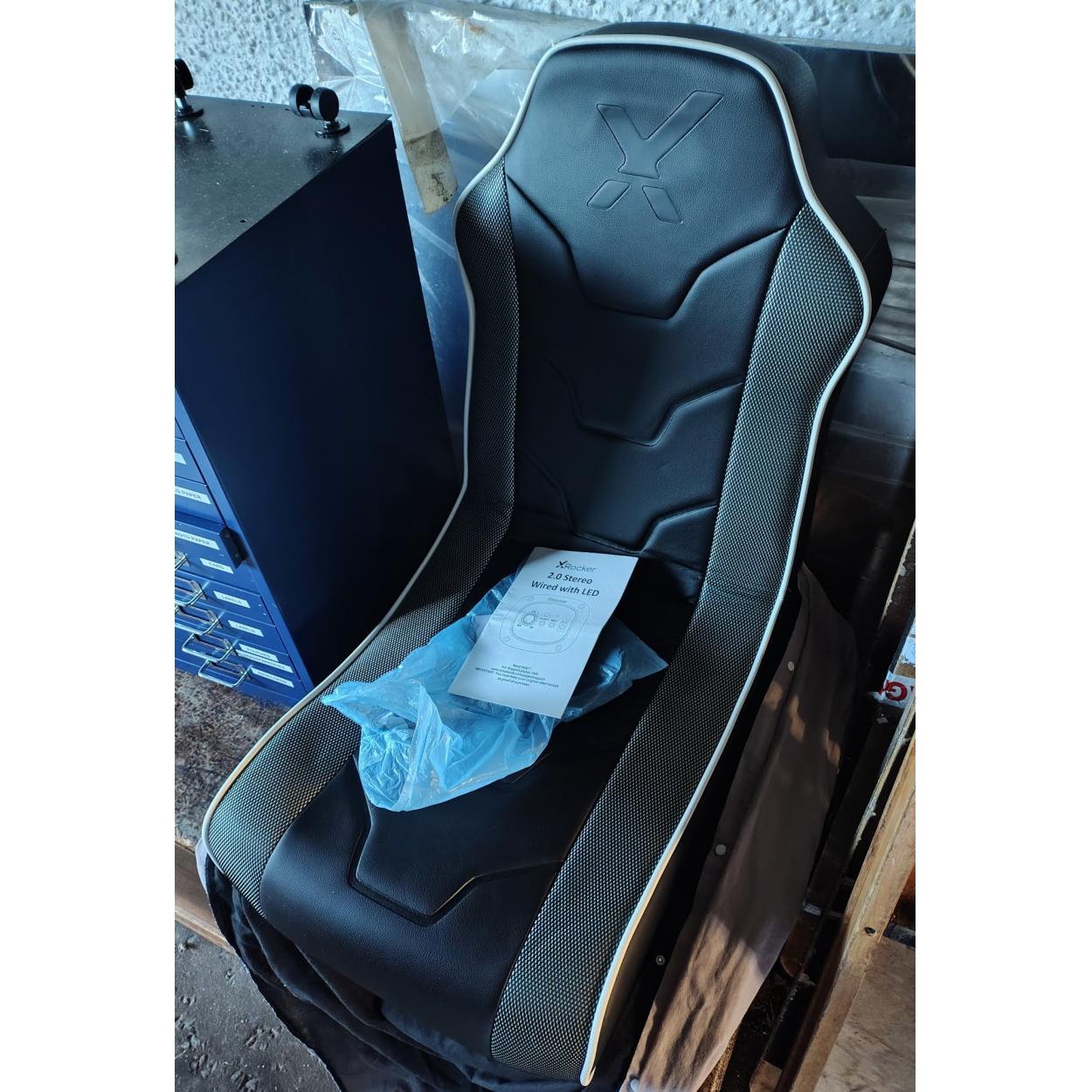 A black coloured X rocker 2.0 stereo gamer chair with LED lights, stereo speakers, all cables and original instruction manual.
