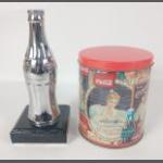 COCA COLA memorabilia to include a Coke tin (16cm tall) containing an unopened 700 piece jigsaw puzzle, and a white metal Coke bottle on a wooden plinth (23cm tall)