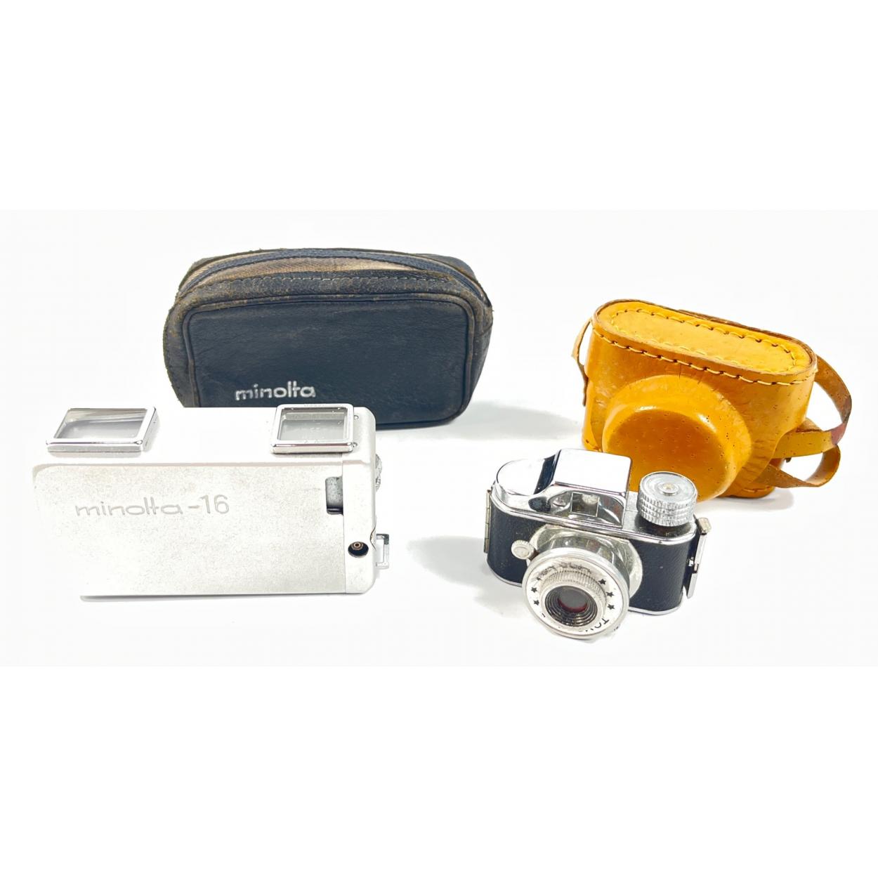 SPYING GAME! A TOYACA miniature camera, shutter 1/25,14 mm, camera size 55x30x30mm in a mustard coloured leather case (made in Japan) plus a MINOLTA 16 spy camera in leather pouch Rokkor 1:28, F=22mm