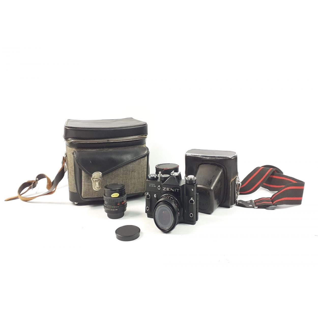 A vintage ZENIT TTL 35mm camera fitted with a CARL ZEISS JENNA DDR lens also with a spare ENSINOR lens and contained in a camera bag