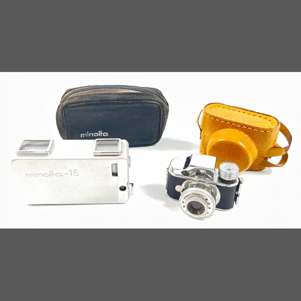 SPYING GAME! A TOYACA miniature camera, shutter 1/25,14 mm, camera size 55x30x30mm in a mustard coloured leather case (made in Japan) plus a MINOLTA 16 spy camera in leather pouch Rokkor 1:28, F=22mm
