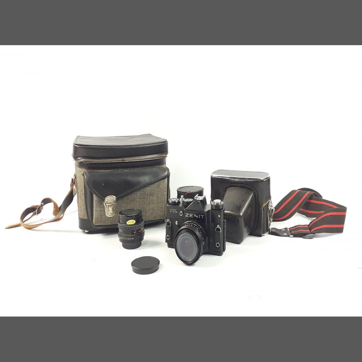 A vintage ZENIT TTL 35mm camera fitted with a CARL ZEISS JENNA DDR lens also with a spare ENSINOR lens and contained in a camera bag