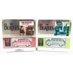 THE BEATLES single sleeve die-cast collectables series 1 and 2. The shrink-wrapped tins contain model taxis, XL t-shirt and enamel wall plaque tin. Tin measures 20cm, Series 1 tin has a small dent in the lid
