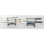 Two small decorative modern plastic stands with model Samurai swords. Two stands, five miniature swords in total.
