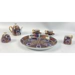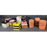 A lot of LIQUORICE ALLSORTS jars (tallest 17cm high) and covers along with three utensil cylindrical pots, 15cm high. Condition - one pot has a chip. Some of the jars have scratches and stains.